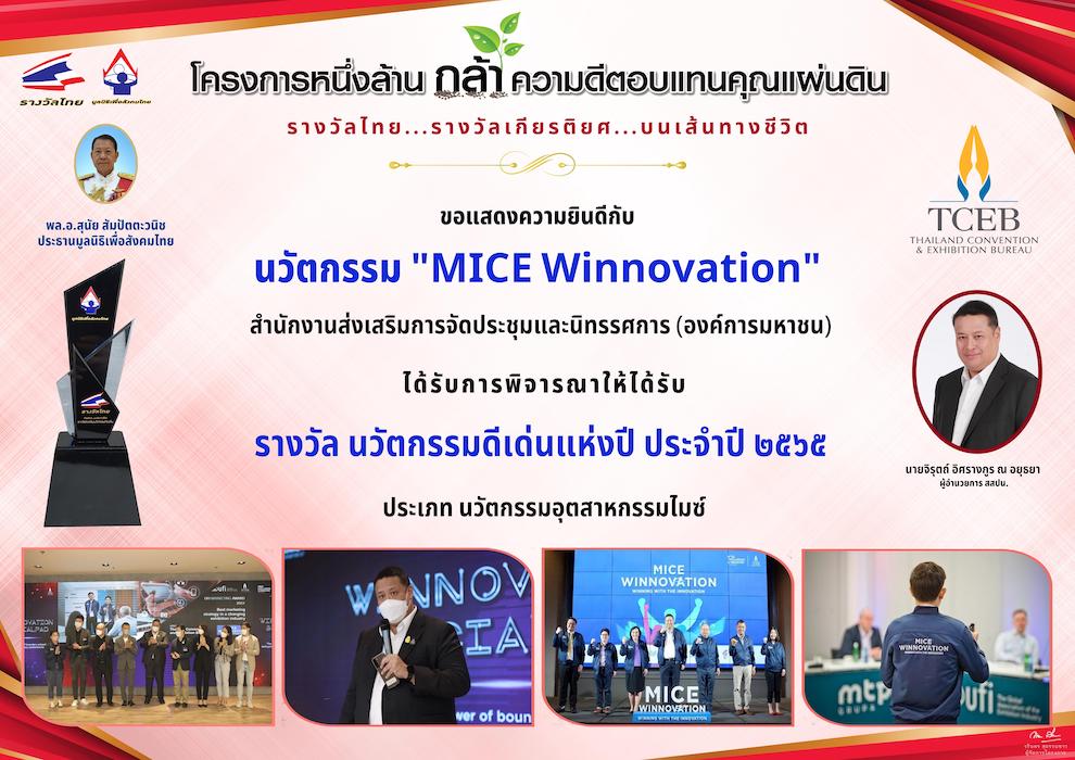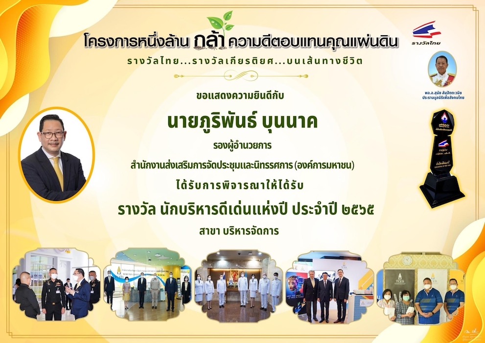 สำนักงานส่งเสริมการจัดประชุมและนิทรรศการ (องค์การมหาชน) หรือ ทีเส็บ ได้รับ 2 รางวัลเกียรติยศ ประจำปี 2565 จากโครงการหนึ่งล้านกล้าความดีตอบแทนคุณแผ่นดิน ของมูลนิธิเพื่อสังคมไทย โดยทีเส็บได้รับรางวัลองค์กร นวัตกรรมดีเด่นแห่งปี ประเภทนวัตกรรมอุตสาหกรรมไมซ์ จากนวัตกรรม “MICE Winnovation” และ นายภูริพันธ์ บุนนาค รองผู้อำนวยการ สายงานบริหาร ทีเส็บ ได้รับรางวัลนักบริหารดีเด่นแห่งปี สาขาบริหารจัดการ ณ หอประชุมกองทัพอากาศ