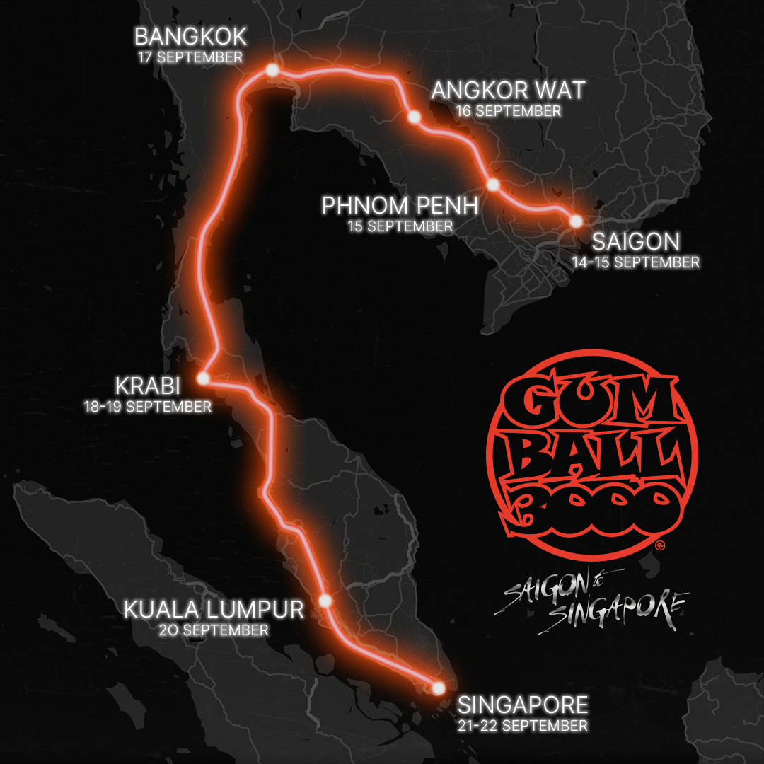 เหล่าซูเปอร์สตาร์และซูเปอร์คาร์ระดับโลกมารวมตัวกันเพื่อเข้าร่วม Gumball 3000 Rally ฉลองครบรอบ 25 ปี บนเส้นทางยาว 3,000 กม. 6 วัน 5 ประเทศ ตั้งแต่ 14 ถึง 22 กันยายนนี้ เริ่มต้นจากไซง่อน (โฮจิมินห์ซิตี) เวียดนาม ผ่านกัมพูชา ไทย มาเลเซีย สิ้นสุดที่สิงคโปร์เพื่อร่วมงาน F1 พร้อมจัดงานเทศกาลรถยนต์ ดนตรี และงานเฉลิมฉลองในทุกประเทศ