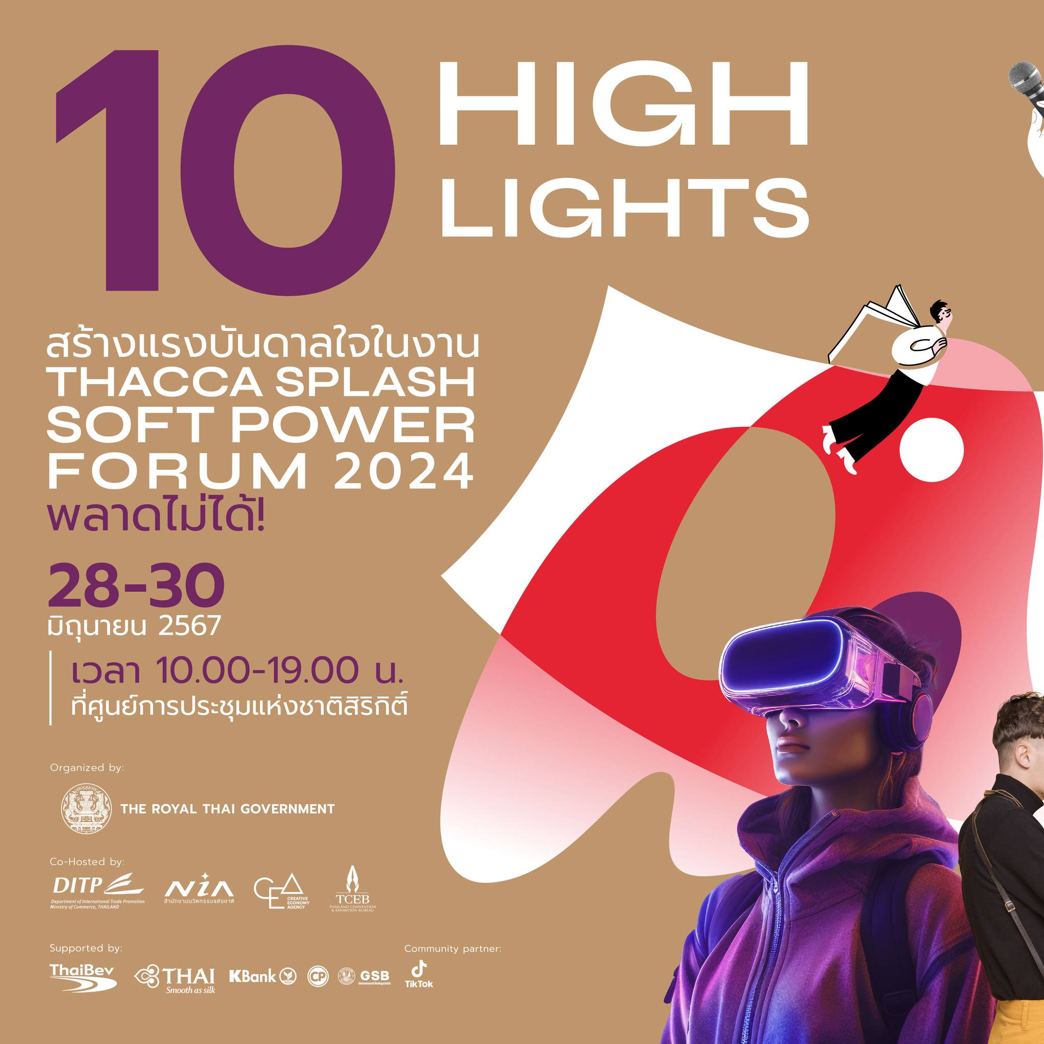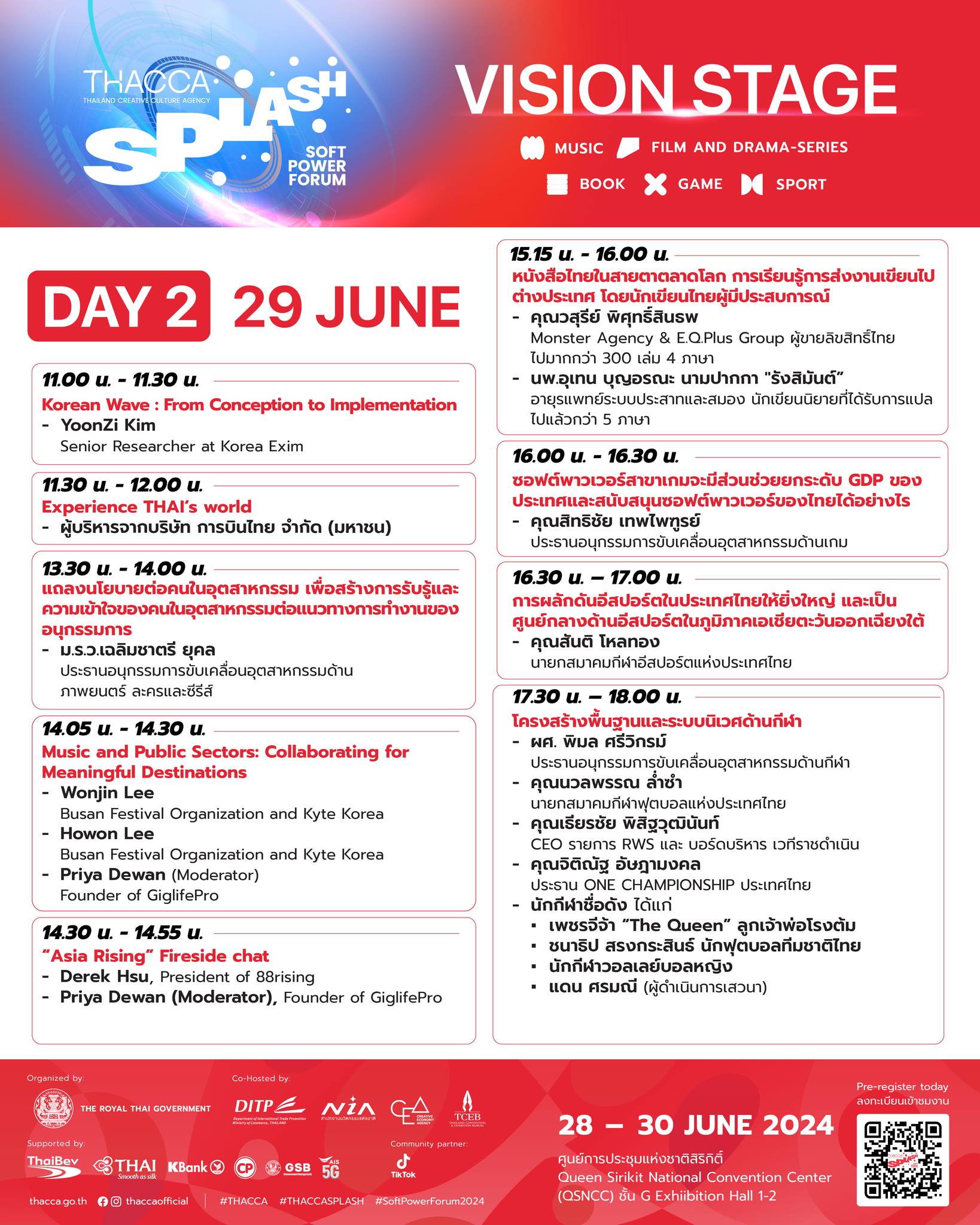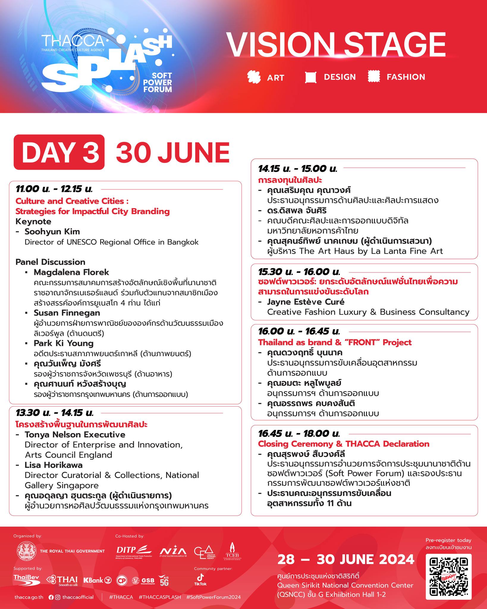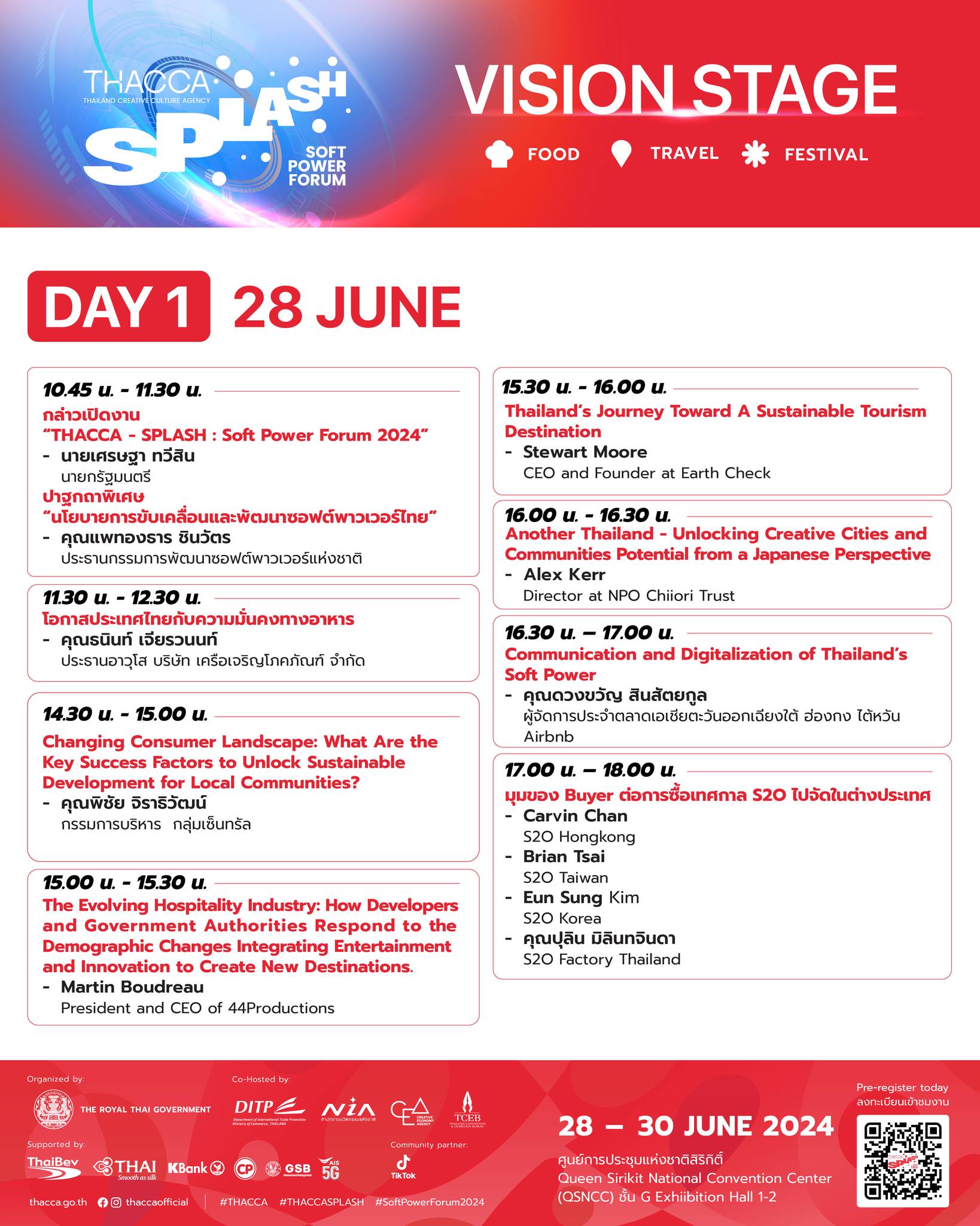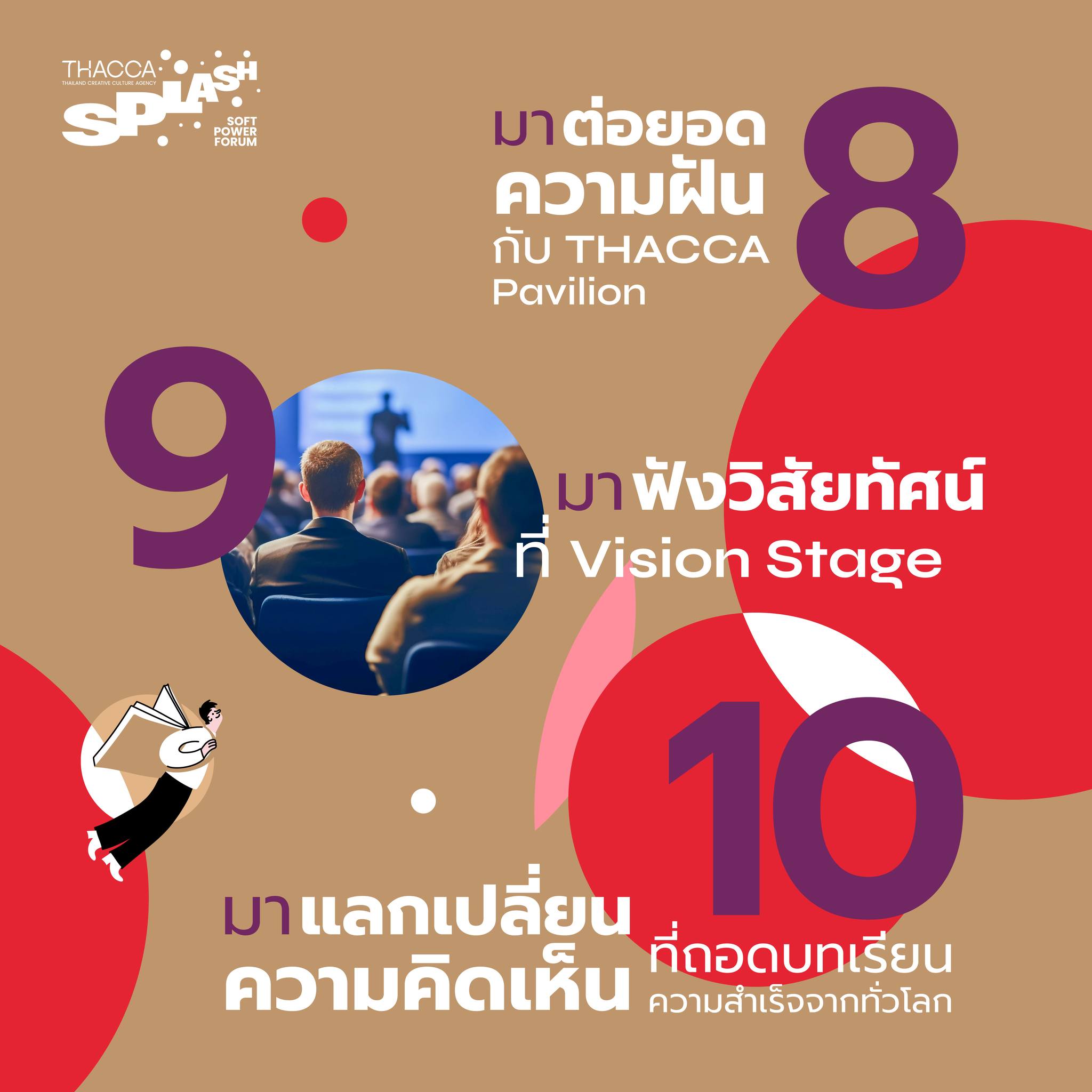 พบกับประสบการณ์สุดยอดแห่งปีบนเวที Vision Stage ในงาน “THACCA SPLASH : Soft Power Forum 2024” ที่รวบรวมผู้เชี่ยวชาญระดับโลกมาร่วมแบ่งปันวิสัยทัศน์ อัพเดตเทรนด์โลก และแลกเปลี่ยนกรณีศึกษาที่ประสบความสำเร็จในต่างประเทศ เพื่อเป็นแรงบันดาลใจและสร้างโอกาสทางธุรกิจใน 11 อุตสาหกรรมวัฒนธรรมสร้างสรรค์