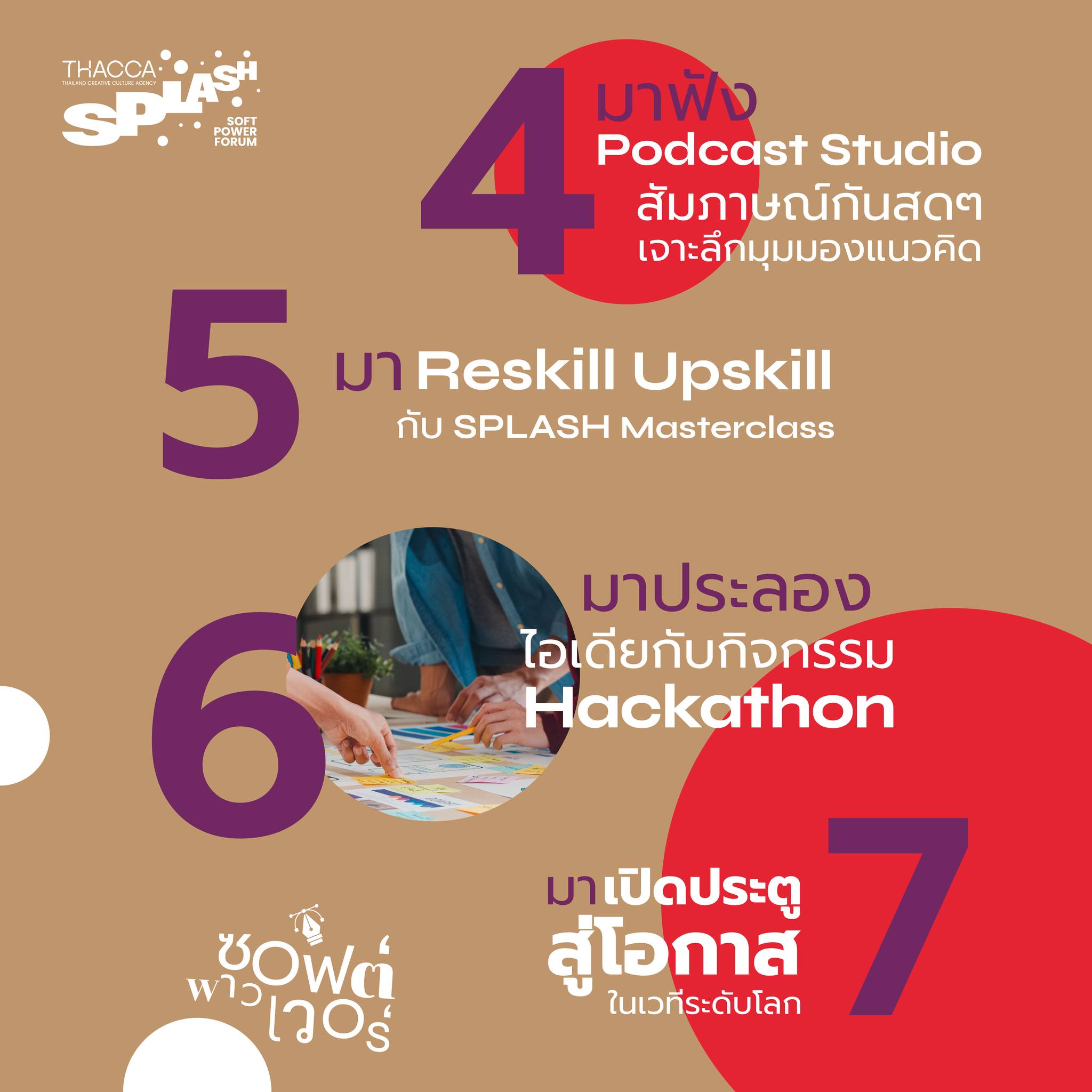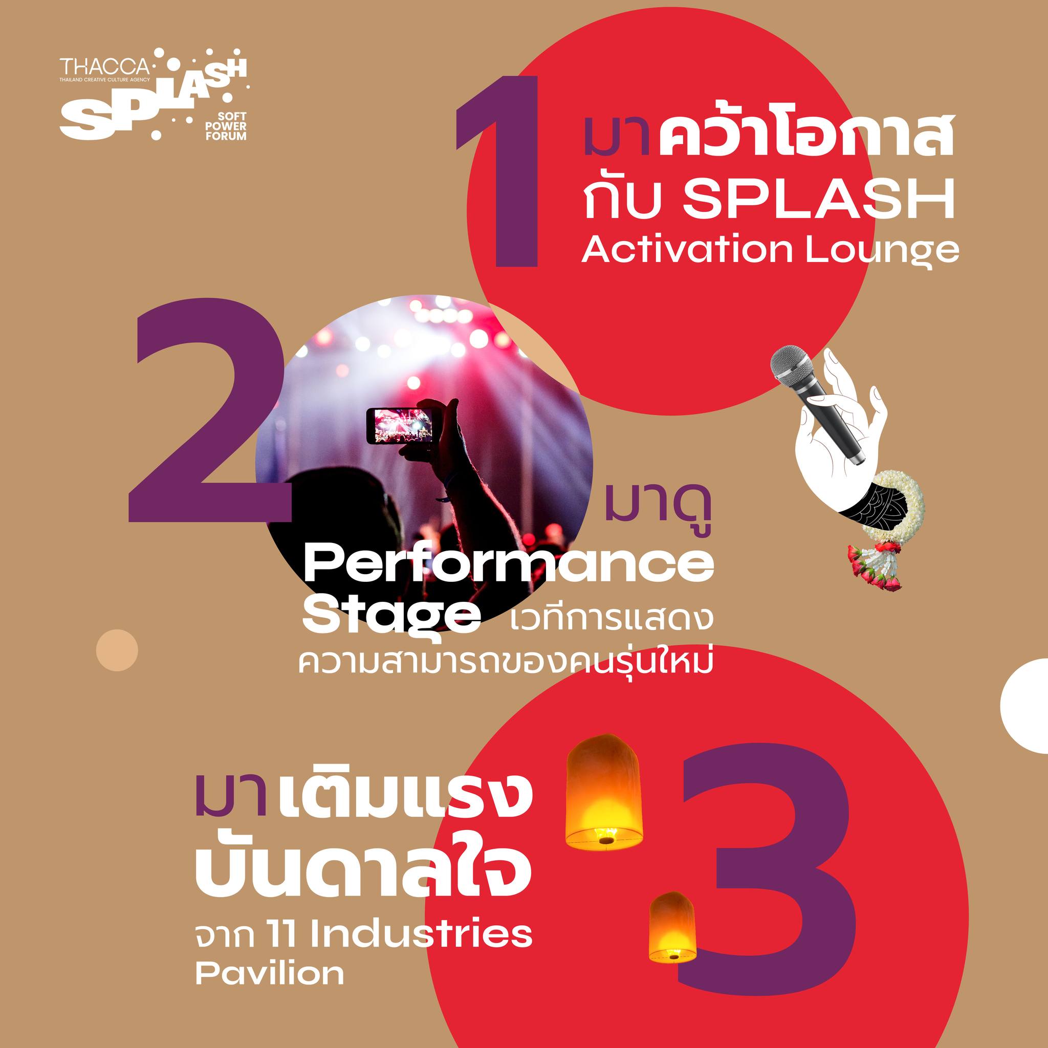 พร้อมพบกับโซน “SPLASH Masterclass ห้องเรียน Reskill Upskill และพื้นที่กิจกรรม Hackathon ประลองไอเดียกัน และสุดท้ายขาดไม่ได้ คือ SPLASH Activation Lounge พื้นที่สำหรับแลกเปลี่ยนความรู้ สร้างความร่วมมือ พร้อมทำให้เกิด Matching ธุรกิจ อื่นๆ ที่เกี่ยวข้องกับ 11 อุตสาหกรรมด้วย