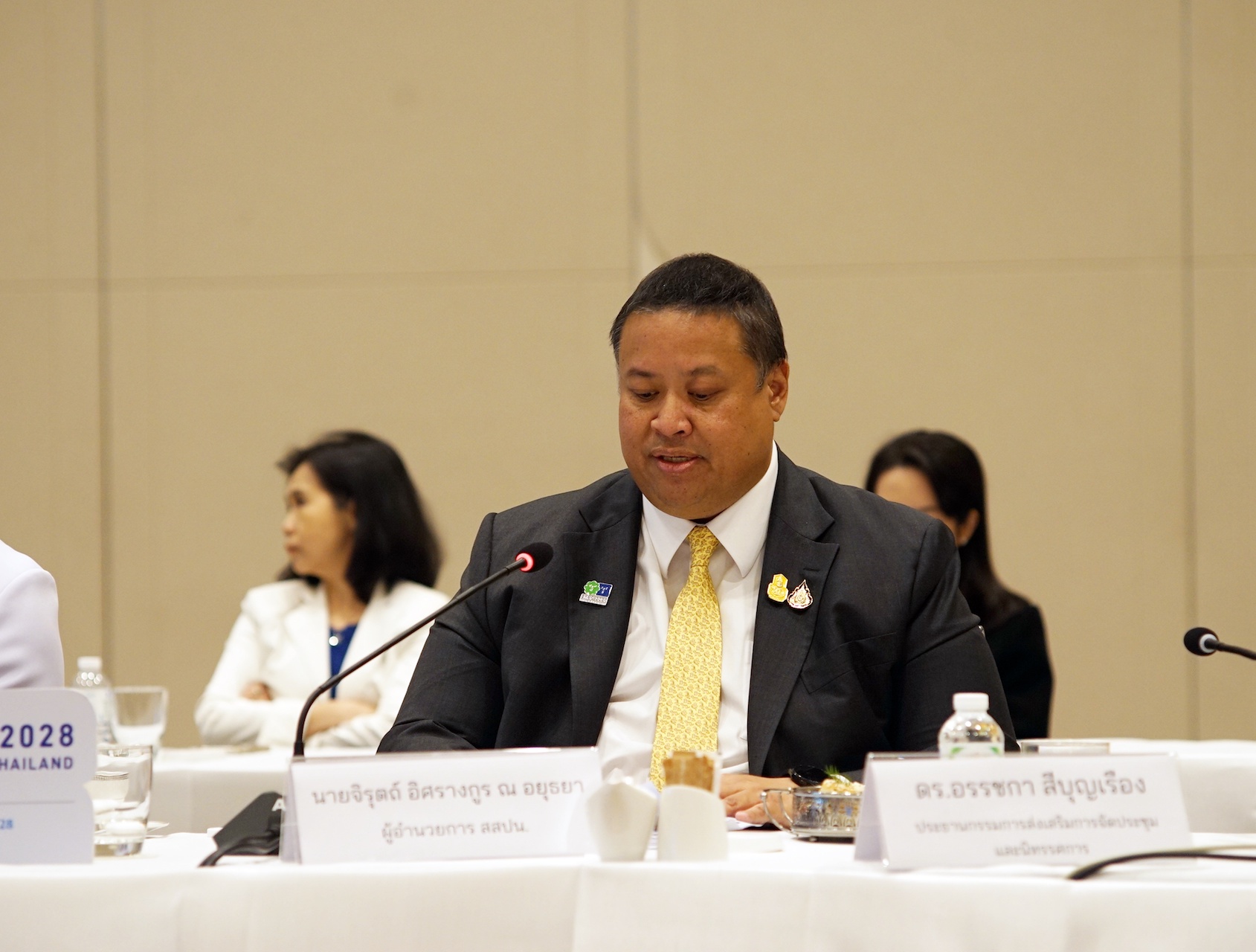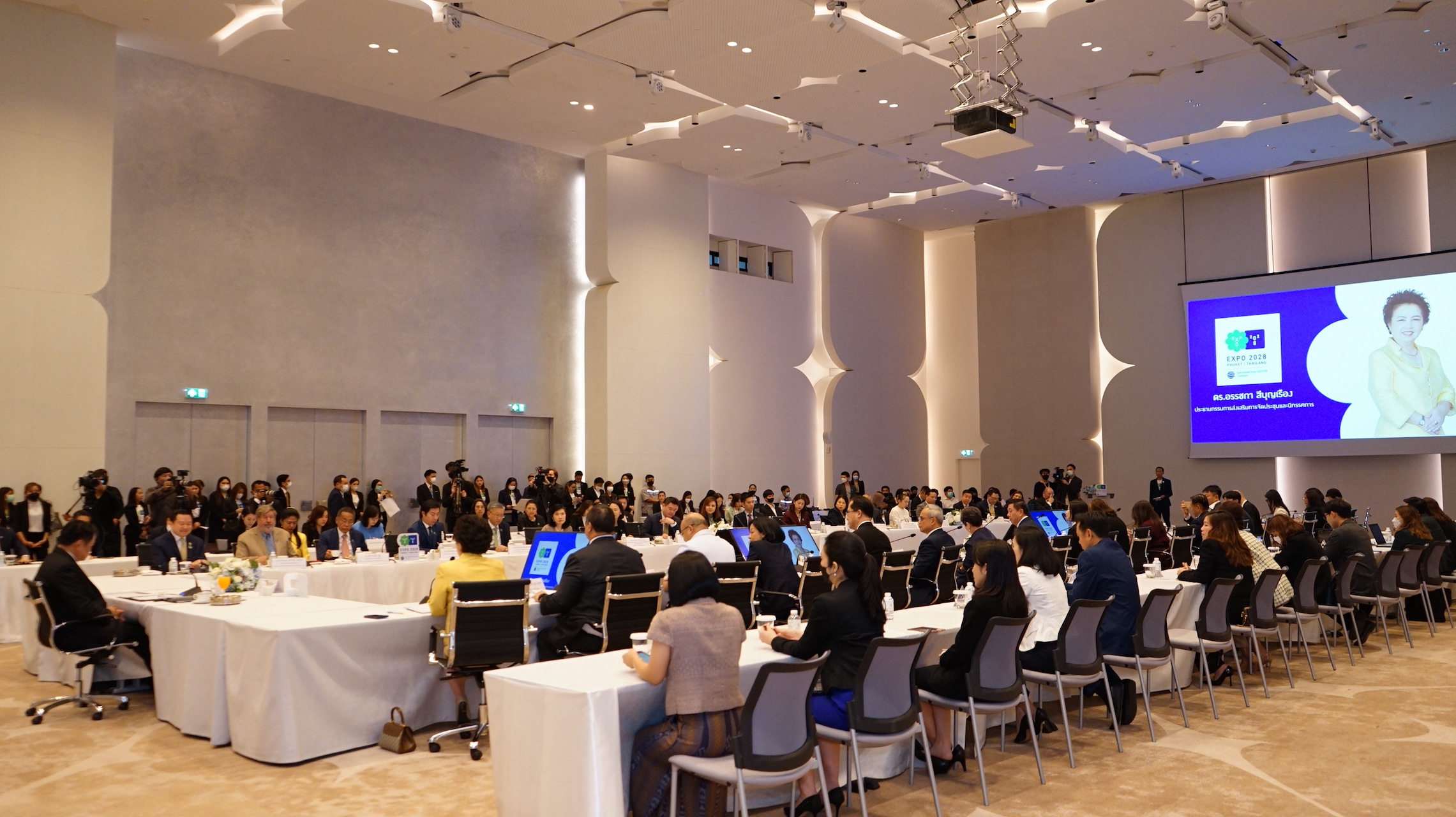 ด้านนายจิรุตถ์ อิศรางกูร ณ อยุธยา ผู้อำนวยการสำนักงานส่งเสริมการจัดประชุมและนิทรรศการ (องค์การมหาชน) หรือ ทีเส็บ นำเสนอความคืบหน้าในการเสนอตัวเป็นเจ้าภาพจัดงาน Expo 2028 Phuket Thailand ต่อที่ประชุมผู้บริหารระดับสูงจากสมาคมและหน่วยงานหลักของภาคเอกชนไทยที่เข้าร่วมงานในกลุ่มธุรกิจ อาทิ กลุ่มธนาคาร กลุ่มพลังงาน กลุ่มโรงพยาบาล กลุ่มโรงแรม กลุ่มสายการบิน กลุ่มรีเทล และกลุ่มเครื่องดื่ม รวมถึง สภาหอการค้าฯ และสมาคมธนาคารไทย เพื่อร่วมกันสนับสนุนการประมูลสิทธิครั้งนี้ โดย ทีเส็บ ร่วมกับหน่วยงานไทยทีม ได้แก่ กระทรวงสาธารณสุข จังหวัดภูเก็ต กระทรวงการต่างประเทศ กระทรวงพาณิชย์ กระทรวงการท่องเที่ยวและกีฬา และการท่องเที่ยวแห่งประเทศไทย เร่งดำเนินการจัดกิจกรรมเพื่อสนับสนุนการหาเสียงของประเทศไทย ทั้งในและต่างประเทศ โดยกิจกรรมสำคัญที่จะจัดขึ้นต่อไป คือ “การจัดงาน Expo 2028 Phuket Thailand Symposia” เชิญกลุ่มเป้าหมายคณะกรรมการและประเทศสมาชิก BIE เข้าร่วมงาน เพื่อรับฟังข้อมูลแนวคิดหลัก และจุดยืนของประเทศไทยในการเสนอตัวเป็นเจ้าภาพในครั้งนี้ พร้อมทั้งนำเสนอศักยภาพของจังหวัดภูเก็ตและประเทศไทยในการจัดงานภายใต้แนวคิด “Future of Life: Living in Harmony, Sharing Prosperity” หรือชีวิตแห่งอนาคต แบ่งปันความรุ่งเรือง อยู่ร่วมกันเป็นหนึ่งเดียว เพื่อมุ่งเน้นการเป็นเวทีระดับโลกในการแบ่งปันประสบการณ์และสนับสนุนให้ประเทศผู้เข้าร่วมงานได้แสดงนโยบายและนวัตกรรมที่จะนำไปสู่การสร้างความยั่งยืนร่วมกัน ทั้งในมิติสิ่งแวดล้อม สังคมและการกำกับดูแล ซึ่งสอดคล้องกับแนวคิด ESG หรือสิ่งแวดล้อม (Environmental) สังคม (Social) และธรรมาภิบาล (Governance) โดยจะมีการจัดงานขึ้นในวันที่ 22 กุมภาพันธ์ ณ กรุงปารีส ประเทศฝรั่งเศส